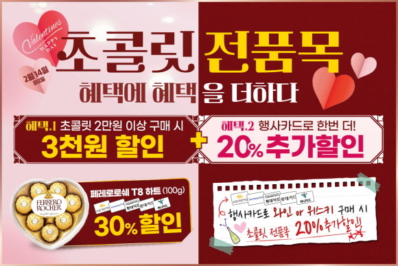 다양한 추가할인 혜택도 준비돼 있다. 초콜릿 전품목을 2만원 이상 구매 시 3000원의 추가 할인이 적용되며, 와인이나 위스키와 함께 행사카드(KB국민, 삼성, 현대, 롯데, 하나카드)로 초콜릿을 구매하면 초콜릿 전품목에 20%의 할인이 한 번 더 적용된다.