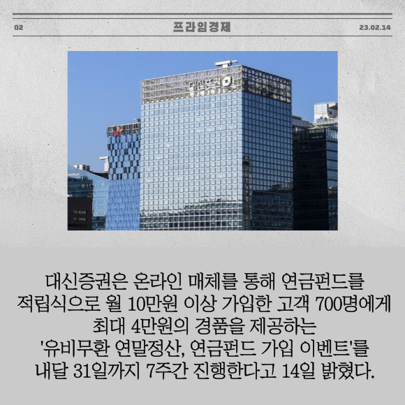 [프라임경제] 대신증권(003540)은 온라인 매체를 통해 연금펀드를 적립식으로 월 10만원 이상 가입한 고객 700명에게 최대 4만원의 경품을 제공하는 '유비무환 연말정산, 연금펀드 가입 이벤트'를 내달 31일까지 7주간 진행한다고 14일 밝혔다.