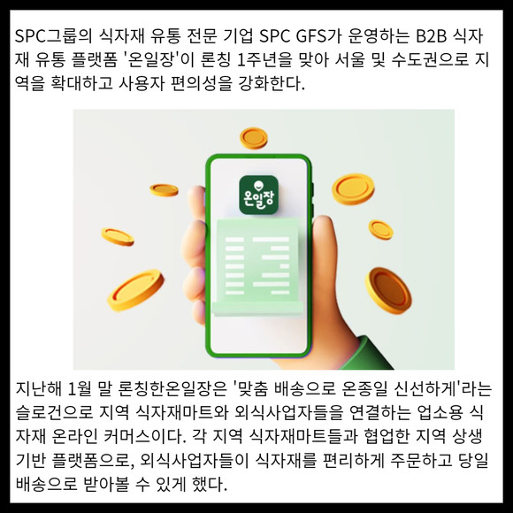 [프라임경제] SPC그룹(회장 허영인)의 식자재 유통 전문 기업 SPC GFS가 운영하는 B2B 식자재 유통 플랫폼 '온일장'이 론칭 1주년을 맞아 서울 및 수도권으로 지역을 확대하고 사용자 편의성을 강화한다.