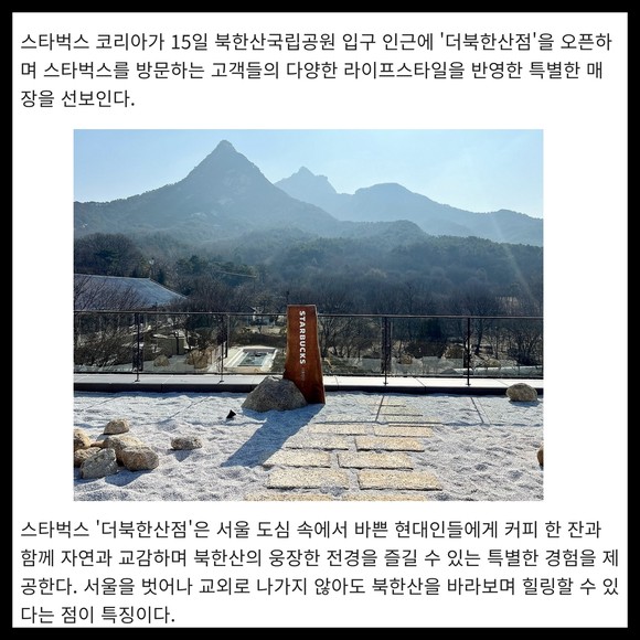 [프라임경제] 스타벅스 코리아가 15일 북한산국립공원 입구 인근에 '더북한산점'을 오픈하며 스타벅스를 방문하는 고객들의 다양한 라이프스타일을 반영한 특별한 매장을 선보인다.