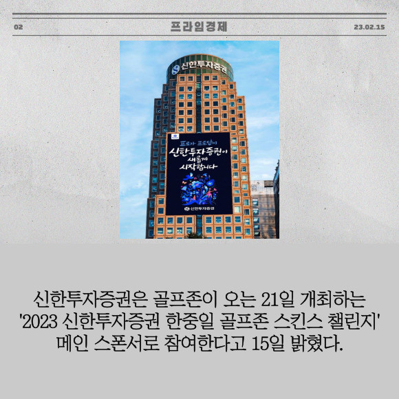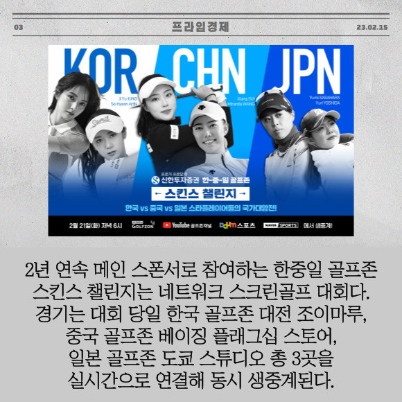 [프라임경제] 신한투자증권은 골프존(215000)이 오는 21일 개최하는 '2023 신한투자증권 한중일 골프존 스킨스 챌린지' 메인 스폰서로 참여한다고 15일 밝혔다.