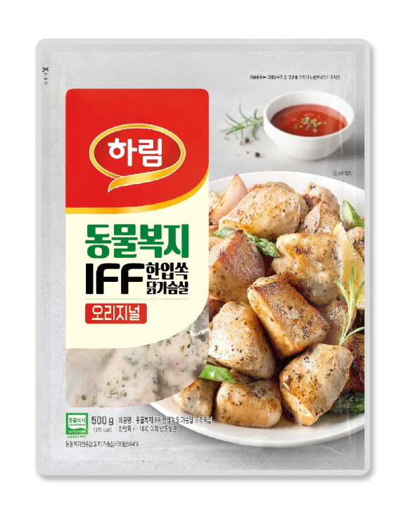 하림의 '동물복지 IFF 한입쏙 닭가슴살 오리지널'은 농림축산식품부로부터 동물복지와 무항생제 인증을 받은 농가에서 건강하게 키운 프리미엄 닭을 사용했다. 닭가슴살을 한입에 먹기 좋은 크기로 손질한 후 맛있게 양념한 제품이라 익히기만 하면 바로 즐길 수 있어 편리하다. 영하 35℃ 이하에서 40분간 개별 급속 동결하는 IFF(Individual Fresh Frozen) 기법을 적용해 육질이 더 신선하며, 촉촉한 식감을 살려 퍽퍽하지 않다. 100g당 19~20g의 단백질을 맛있게 섭취할 수 있다.