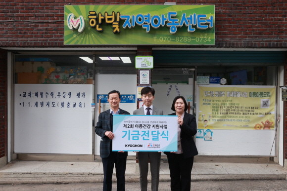 교촌은 지난 15일 대구시 한빛지역아동센터에서 지원금 전달식을 마련하고 지원금 9천만원을 전달했다. 다가오는 새 학기를 응원하는 마음을 담아 교촌의 치킨나눔인 '교촌 온(溫) –Day'를 마련해 경기도, 강원도, 대구시 내 전국지역아동센터협의회 소속 303여개 지역아동센터 약 8500명의 아동들에게 치킨 간식을 제공할 예정이다.