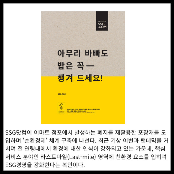[프라임경제] SSG닷컴이 이마트 점포에서 발생하는 폐지를 재활용한 포장재를 도입하며 '순환경제' 체계 구축에 나선다. 최근 기상 이변과 팬데믹을 거치며 전 연령대에서 환경에 대한 인식이 강화되고 있는 가운데, 핵심 서비스 분야인 라스트마일(Last-mile) 영역에 친환경 요소를 입히며 ESG경영을 강화한다는 복안이다.