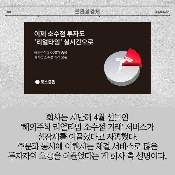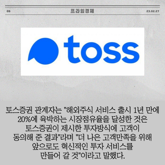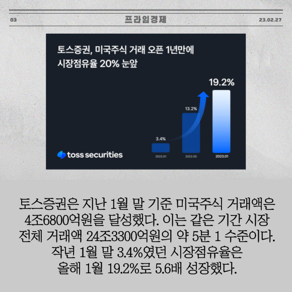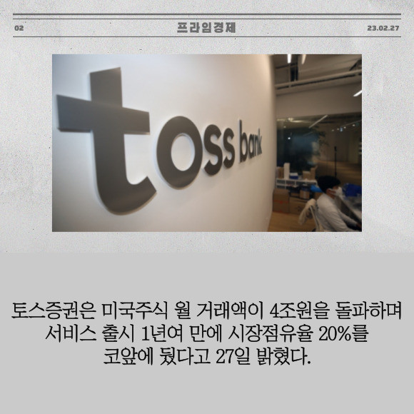 [프라임경제] 토스증권은 미국주식 월 거래액이 4조원을 돌파하며 서비스 출시 1년여 만에 시장점유율 20%를 코앞에 뒀다고 27일 밝혔다.