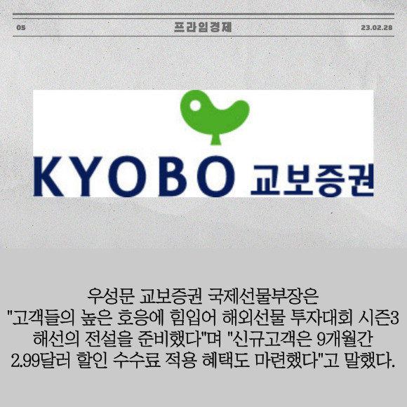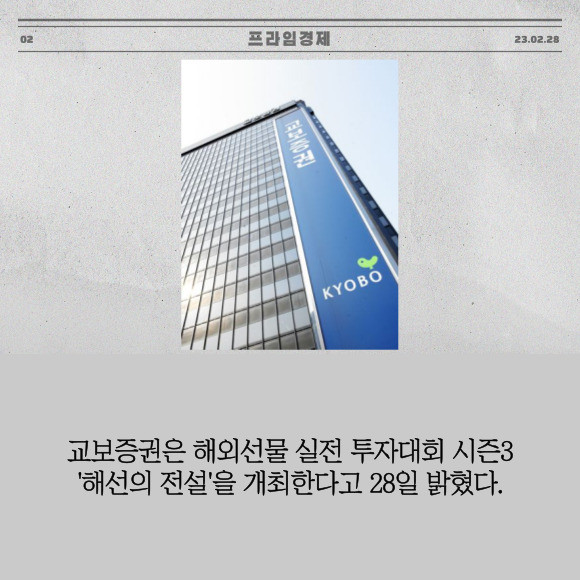 [프라임경제] 교보증권(030610)은 해외선물 실전 투자대회 시즌3 '해선의 전설'을 개최한다고 28일 밝혔다.