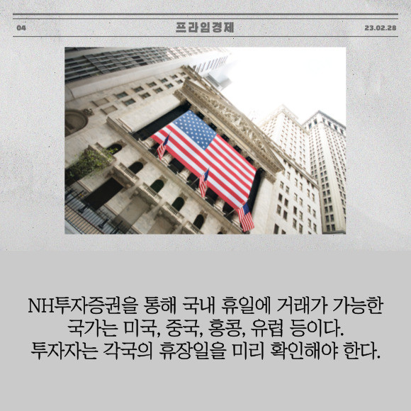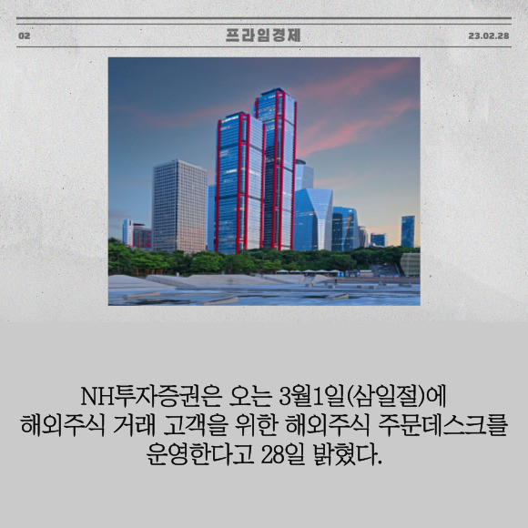 [프라임경제] NH투자증권(005940)은 오는 3월1일(삼일절)에 해외주식 거래 고객을 위한 해외주식 주문데스크를 운영한다고 28일 밝혔다.