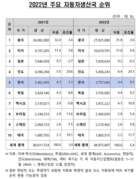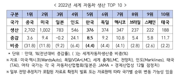 발표에 따르면 지난 2022년 세계 자동차 생산이 전년 대비 5.4% 증가한 8497만대를 기록한 가운데 한국은 8.5% 증가한 376만대를 생산했다. 2016년 이후 6년 연속 지속된 생산 감소에서 벗어나 상승 전환한 것은 물론, 2020년 이후 3년 연속 글로벌 5위를 유지했다.