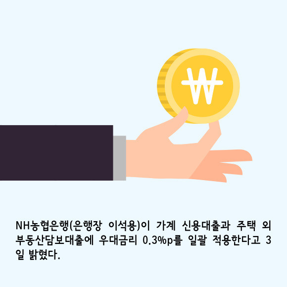 [프라임경제] NH농협은행(은행장 이석용)이 가계 신용대출과 주택 외 부동산담보대출에 우대금리 0.3%p를 일괄 적용한다고 3일 밝혔다.