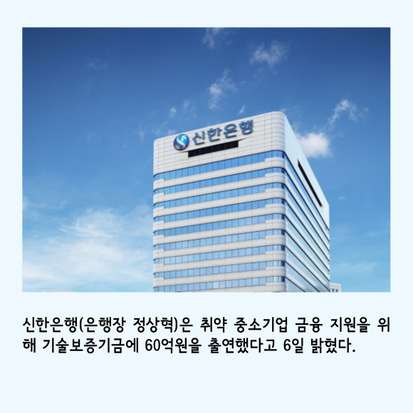 [프라임경제] 신한은행(055550)은 취약 중소기업 금융 지원을 위해 기술보증기금에 60억원을 출연했다고 6일 밝혔다.