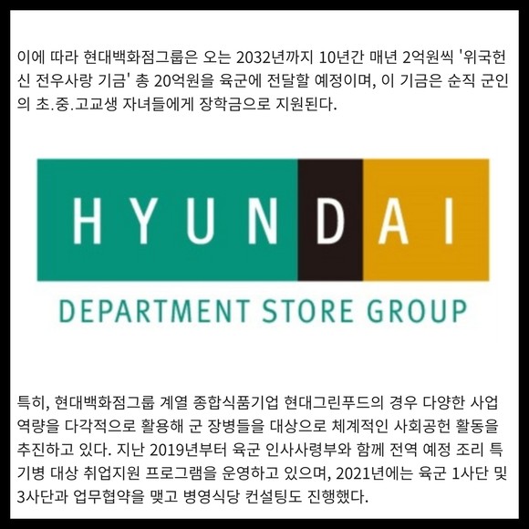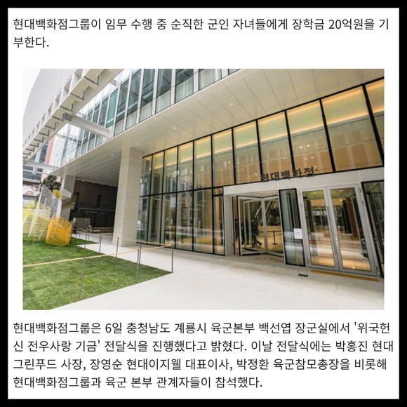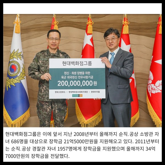 [카드] 현대백화점그룹, 순직 군인 자녀에 장학금 20억원 기부