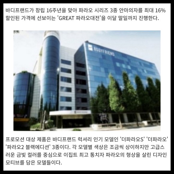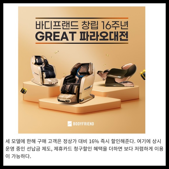 [프라임경제]  바디프랜드가 창립 16주년을 맞아 파라오 시리즈 3종 안마의자를 최대 16% 할인된 가격에 선보이는 'GREAT 파라오대전'을 이달 말일까지 진행한다.