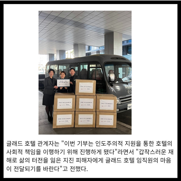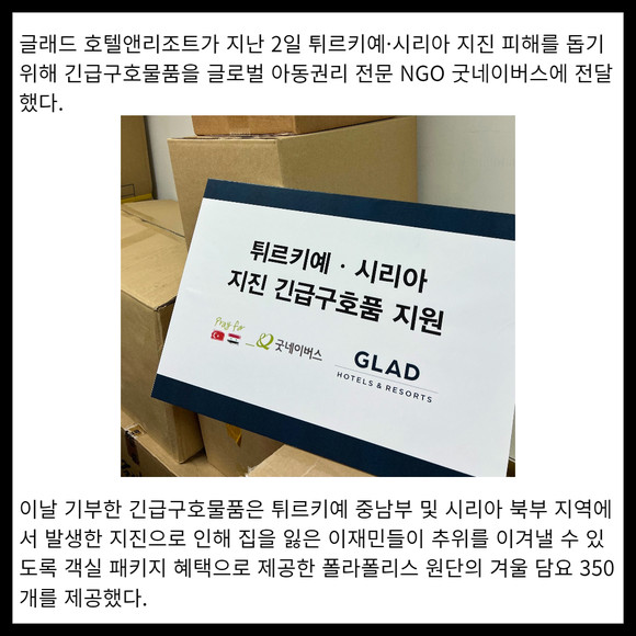 [카드] 글래드 호텔앤리조트, 튀르키예·시리아 지진 긴급구호물품 기부 동참