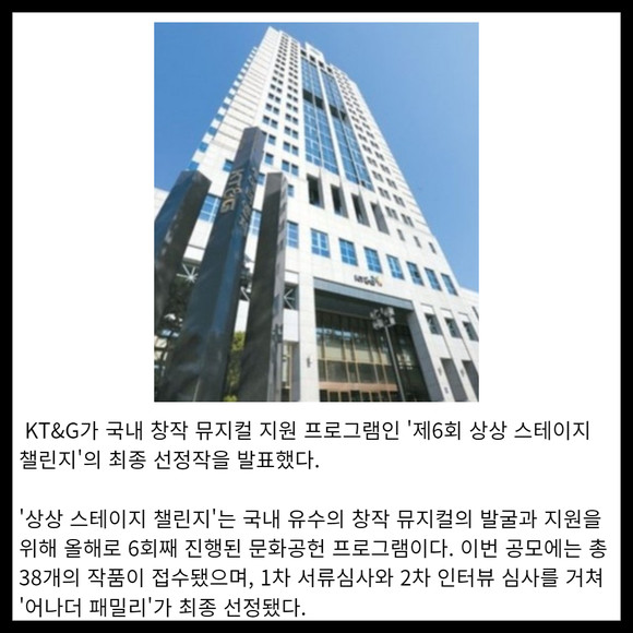 [프라임경제] KT&G가 국내 창작 뮤지컬 지원 프로그램인 '제6회 상상 스테이지 챌린지'의 최종 선정작을 발표했다.