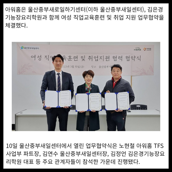 [프라임경제] 아워홈은 울산중부새로일하기센터(이하 울산중부새일센터), 김은경기능장요리학원과 함께 여성 직업교육훈련 및 취업 지원 업무협약을 체결했다.