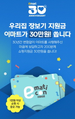 특히 올해 30주년을 맞은 이마트는 그동안 변함없이 이마트를 사랑해준 고객들의 마음에 보답하고자 '우리집 장보기 지원금' 프로모션도 함께 진행한다.