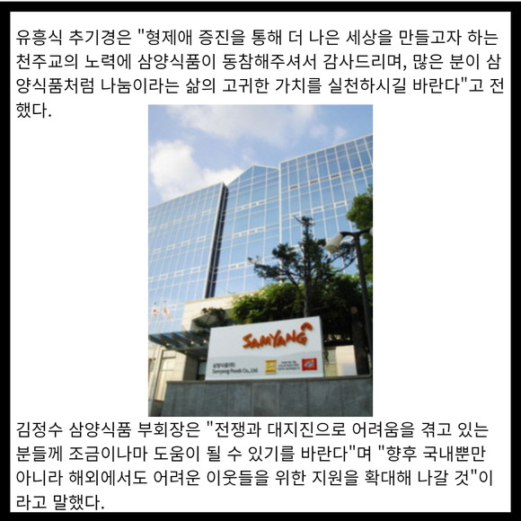 [프라임경제] 삼양식품이 우크라이나 전쟁 및 튀르키예·시리아 대지진 피해자들을 돕기 위해 로마 교황청에 라면 20만개를 전달한다.