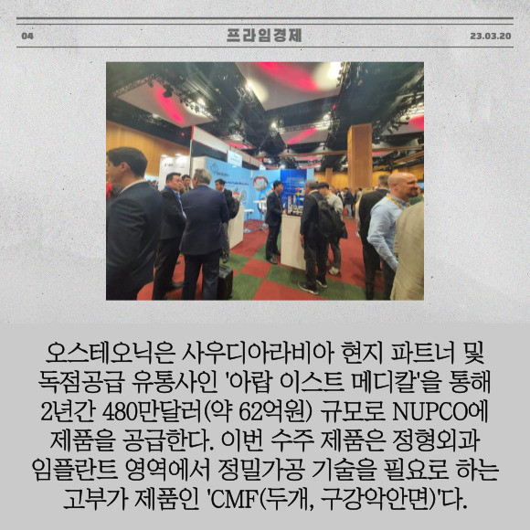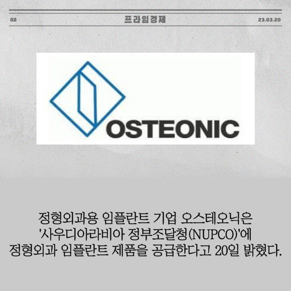 [프라임경제] 정형외과용 임플란트 기업 오스테오닉(226400)은 '사우디아라비아 정부조달청(NUPCO)'에 정형외과 임플란트 제품을 공급한다고 20일 밝혔다.
