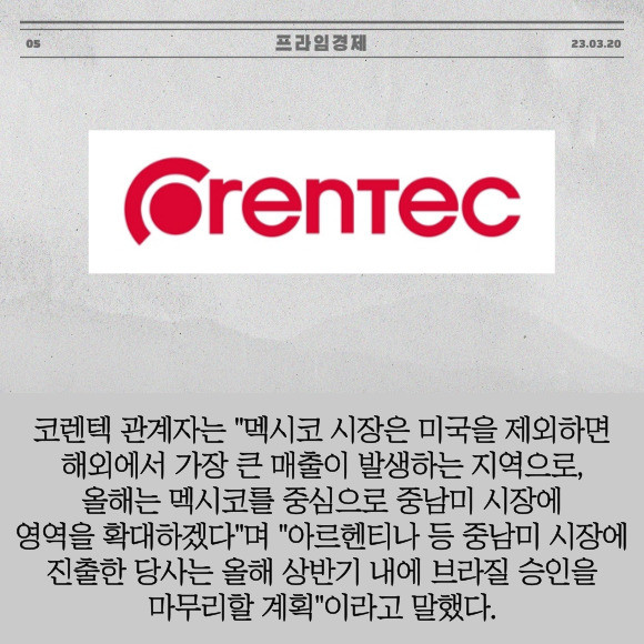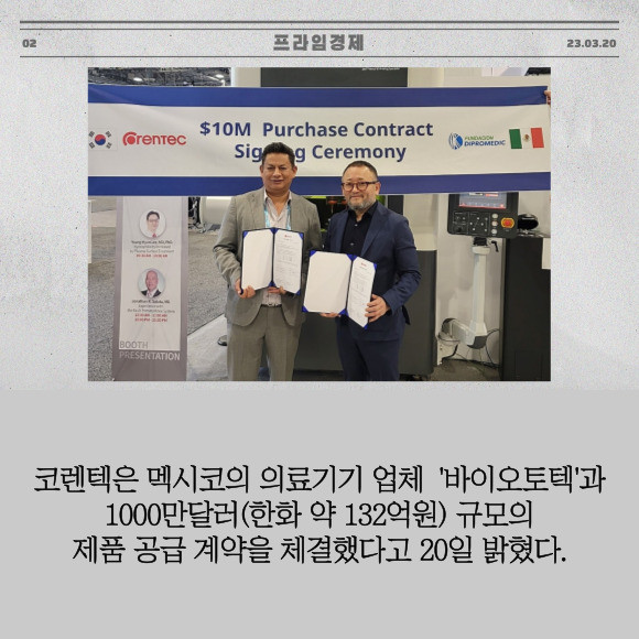 [프라임경제] 코렌텍(104540)은 멕시코의 의료기기 업체 '바이오토텍'과 1000만달러(한화 약 132억원) 규모의 제품 공급 계약을 체결했다고 20일 밝혔다.