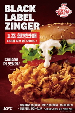 다리살 업그레이드는 징거버거 3종 단품/세트/박스 주문 시 적용할 수 있으며, 매장 주문과 KFC 앱 징거벨오더, 딜리버리를 통해 주문이 가능하다. 자사앱 외 배달앱을 통해서도 주문할 수 있다.