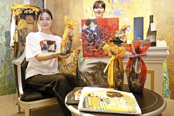 와인과 함께 '이상봉x클림트 컬렉션'을 모티브로 한 디자인의 티셔츠, 스카프, 보자기 형태의 와인 패키지 등 다양한 패브릭 상품을 선보인다.