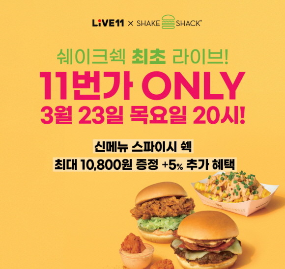 11번가는 23일 오후 8시, 라이브11(LIVE11)을 통해 '쉐이크쉑'의 신 메뉴 '스파이시 쉑' 첫 라이브 방송을 진행한다. 라이브 방송 중에만 적용되는 추가 혜택이 제공되고, 방송 중 추첨과 댓글 이벤트를 통해 '쉐이크쉑 모바일 금액권 1만원'을 경품으로 제공한다.