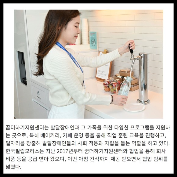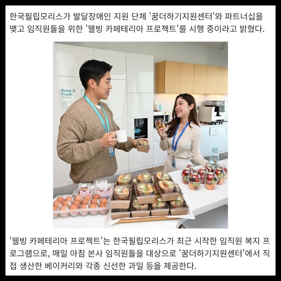 [프라임경제] 한국필립모리스가 발달장애인 지원 단체 '꿈더하기지원센터'와 파트너십을 맺고 임직원들을 위한 '웰빙 카페테리아 프로젝트'를 시행 중이라고 밝혔다.