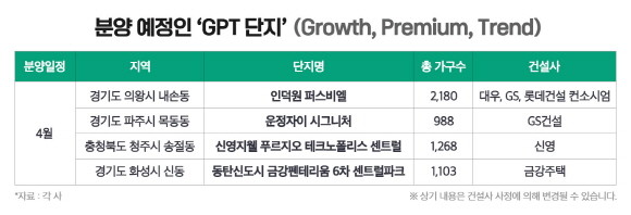 향후 미래가치를 기대할 수 있는 '대형 개발호재(G, Growth)'와 차별성에 따른 '프리미엄(P, Premium)', 수요자 니즈를 반영한 '주거 트렌드(T, Trend)'를 적용한 단지가 침체된 분양시장에서 좋은 성적을 거두면서 GPT를 충족한 단지에 수요자 관심이 집중되고 있다.
