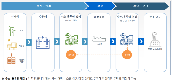 SPERA 수소는 수소에 '톨루엔' 화학물질을 첨가해 원거리 이동 및 저장이 용이한 메틸시클로헥산(MCH) 형태로 변환 후 이송해 수소를 분리하는 방식이다. 수소가 상온·상압 상태로 유지되는 만큼 안정적 운반과 저장이 가능하다.