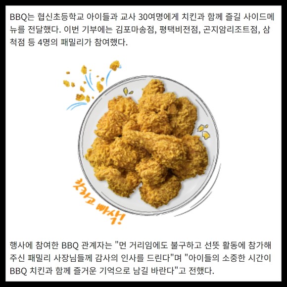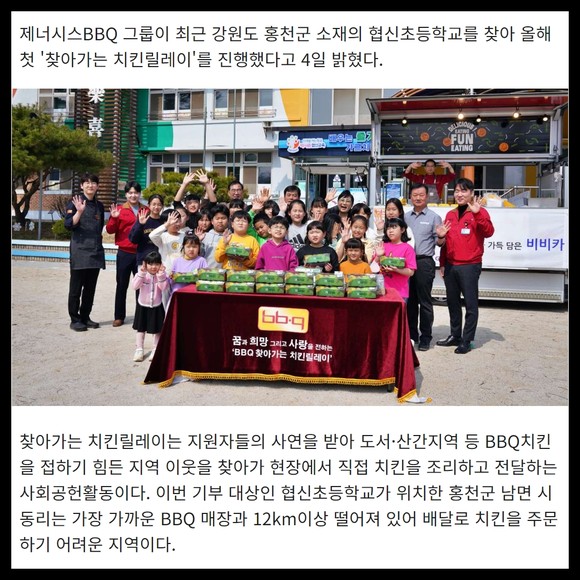[프라임경제] 제너시스BBQ 그룹이 최근 강원도 홍천군 소재의 협신초등학교를 찾아 올해 첫 '찾아가는 치킨릴레이'를 진행했다.