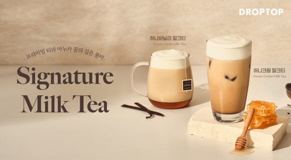 드롭탑이 야심 차게 출시하는 시그니처 메뉴 밀크티 2종은 프리미엄 티 브랜드 '스티븐 스미스 티메이커'의 베르가못 향을 지닌 로드 버가모트 홍차를 사용해 깊은 풍미를 더한 것이 특징이다. 허니바닐라 밀크티, 허니크림 밀크티 등 밀크티 2종이다.