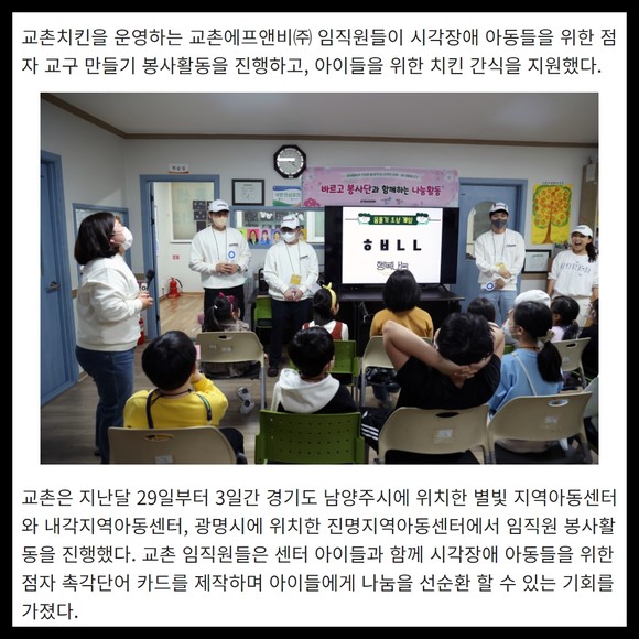 [프라임경제] 교촌치킨을 운영하는 교촌에프앤비㈜ 임직원들이 시각장애 아동들을 위한 점자 교구 만들기 봉사활동을 진행하고, 아이들을 위한 치킨 간식을 지원했다.