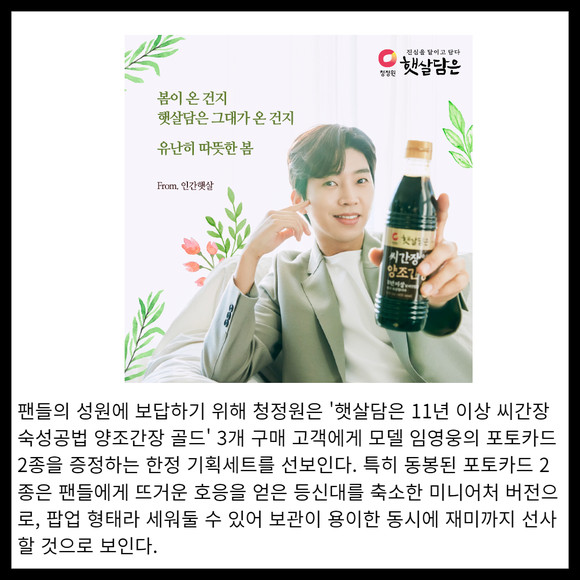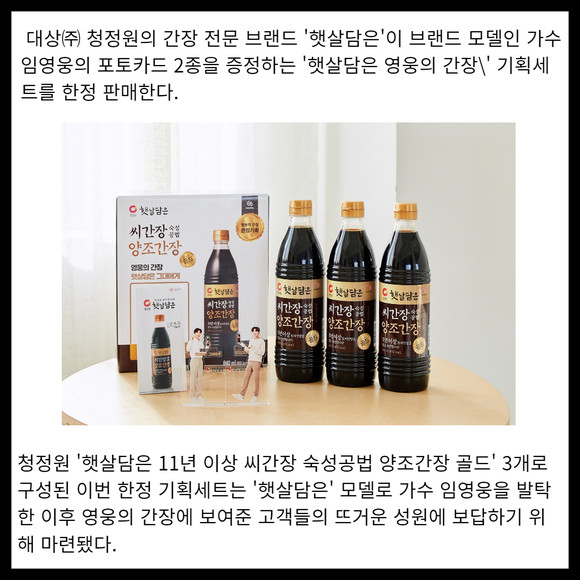 [프라임경제] 대상㈜ 청정원의 간장 전문 브랜드 '햇살담은'이 브랜드 모델인 가수 임영웅의 포토카드 2종을 증정하는 '햇살담은 영웅의 간장' 기획세트를 한정 판매한다.