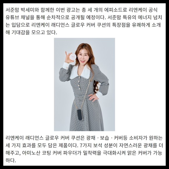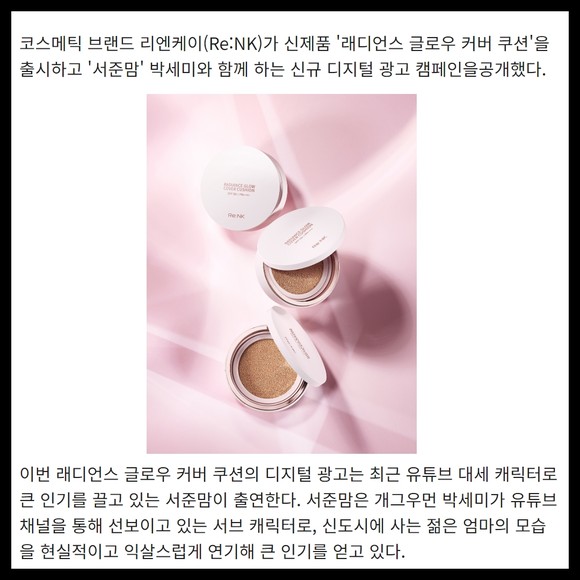 [프라임경제] 코스메틱 브랜드 리엔케이(Re:NK)가 신제품 '래디언스 글로우 커버 쿠션'을 출시하고 '서준맘' 박세미와 함께 하는 신규 디지털 광고 캠페인을공개했다.