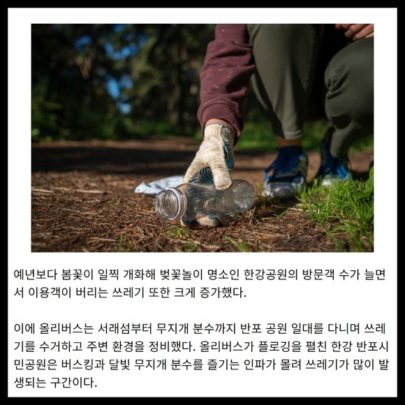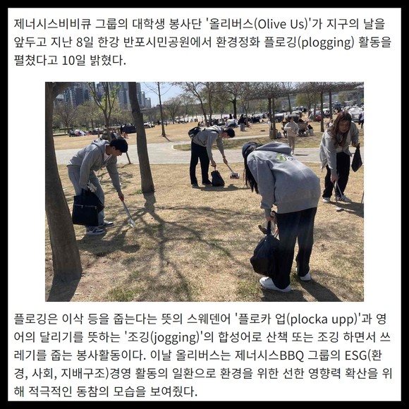 [프라임경제] 제너시스비비큐 그룹의 대학생 봉사단 '올리버스(Olive Us)'가 지구의 날을 앞두고 지난 8일 한강 반포시민공원에서 환경정화 플로깅(plogging) 활동을 펼쳤다고 10일 밝혔다.