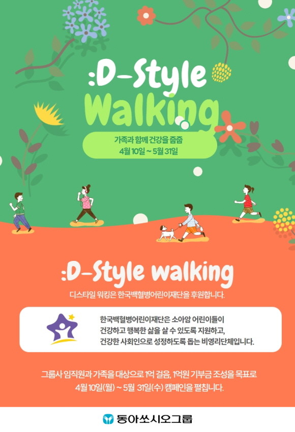 이번 ':D-Style Walking'은 자발적 걸음 기부로 조성된 기부금을 한국백혈병어린이 재단에 후원하는 캠페인으로 임직원의 건강증진과 동시에 건강한 기부 문화를 조성하기 위해 마련됐다.