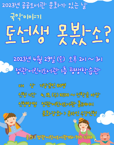 한편, 기장군 오는 4월29일 정관어린이도서관에서 국악공연 '토선생, 못봤소?'를 개최한다고 14일 밝혔다. 문화체육관광부가 주최하고 (재)한국도서관문화진흥원이 주관하는 '2023년 공공도서관 문화가 있는 날' 사업의 일환이다.