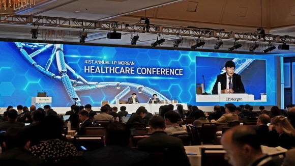 올 1월 미국 샌프란시스코에서 열린 'JP모건 헬스케어 컨퍼런스' 메이트랙에서 발표하고 있는 존 림 삼성바이오로직스 사장. © 삼성바이오로직스
