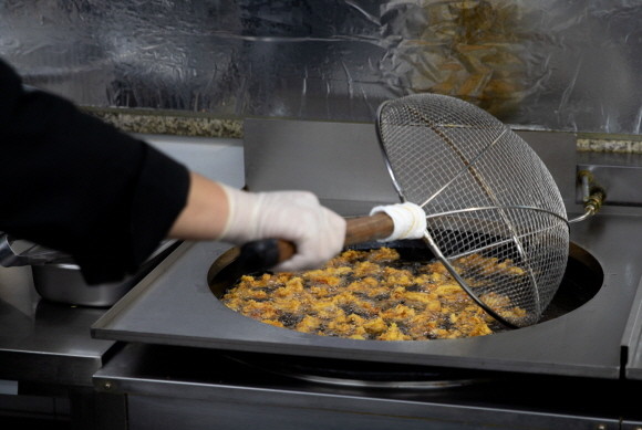 노랑통닭 핵심의 가마솥 튀김기에서 메뉴가 바삭하게 튀겨지고 있다. © 프라임경제