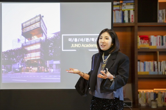 준오그룹을 설명 중인 강윤선 준오헤어 대표. © 준오헤어
