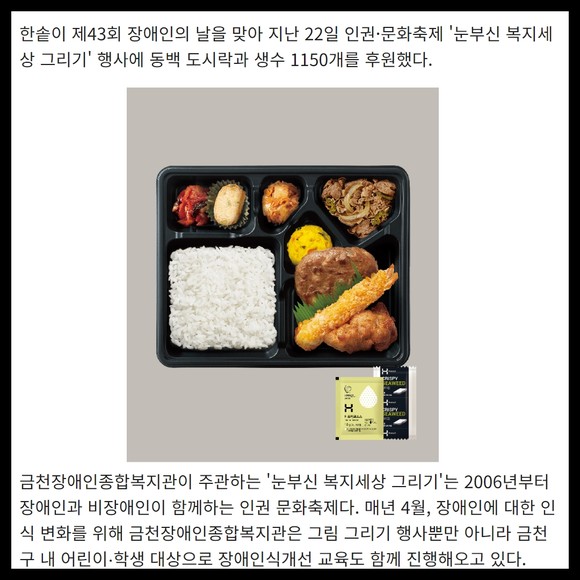 [프라임경제] 한솥이 제43회 장애인의 날을 맞아 지난 22일 인권·문화축제 '눈부신 복지세상 그리기' 행사에 동백 도시락과 생수 1150개를 후원했다.