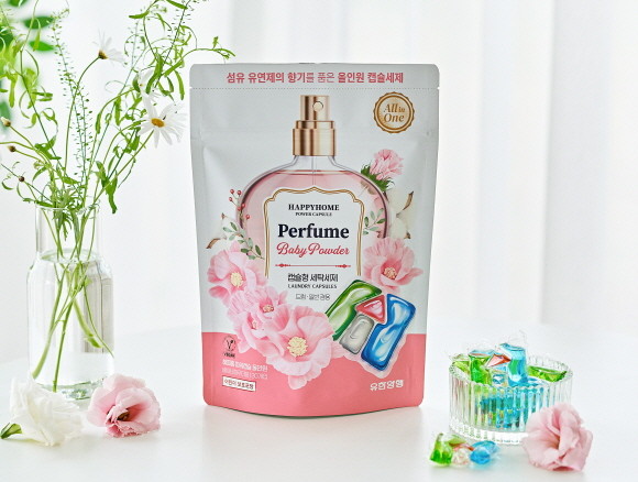 유한양행이 섬유유연제의 향기를 품은 퍼퓸 캡슐세제 '해피홈 파워캡슐 올인원'을 출시했다. © 유한양행