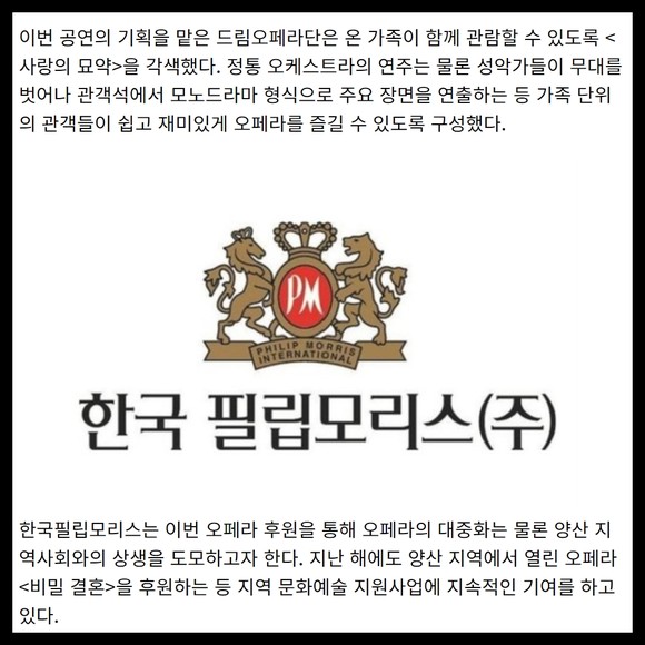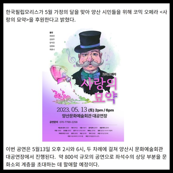 [프라임경제] 한국필립모리스가 5월 가정의 달을 맞아 양산 시민들을 위해 코믹 오페라 <사랑의 묘약>을 후원한다고 밝혔다.