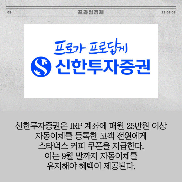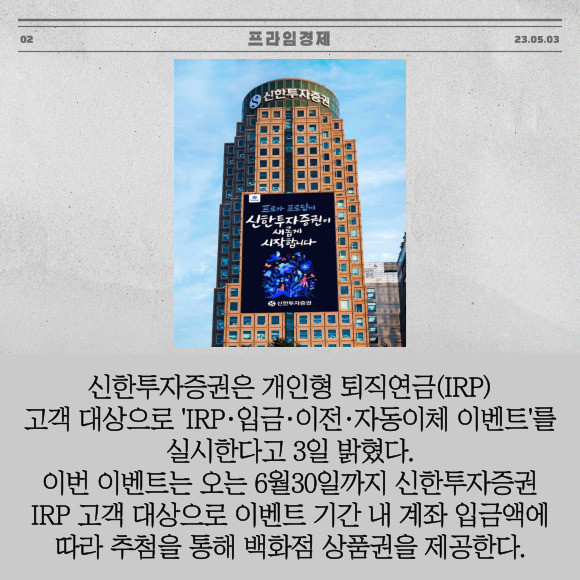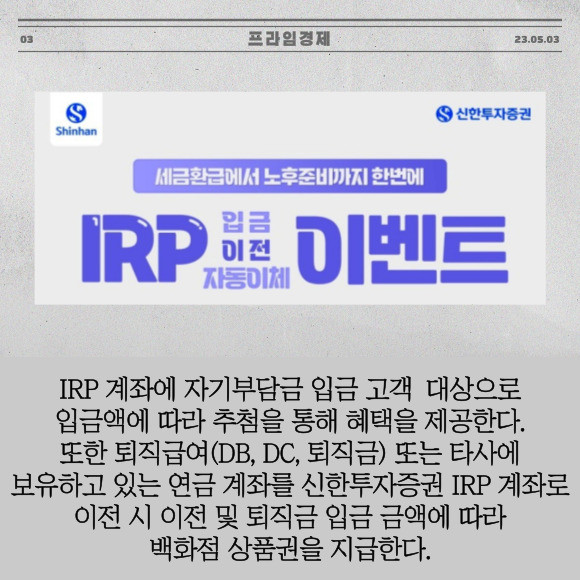 [프라임경제] 신한투자증권은 개인형 퇴직연금(IRP) 고객 대상으로 'IRP·입금·이전·자동이체 이벤트'를 실시한다고 3일 밝혔다.