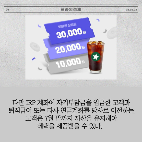 이번 이벤트는 오는 6월30일까지 신한투자증권 IRP 고객 대상으로 이벤트 기간 내 계좌 입금액에 따라 추첨을 통해 백화점 상품권을 제공한다.