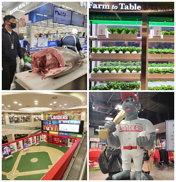 (왼쪽부터 시계방향으로) 생참다랑어 해체 과정, 스마트팜, 랜드서 굿즈 샵, 랜더스 광장. = 추민선 기자