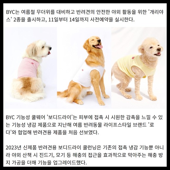 [프라임경제] BYC는 여름철 무더위를 대비하고 반려견의 안전한 야외 활동을 위한 '개리야스' 2종을 출시하고, 11일부터 14일까지 사전예약을 실시한다.