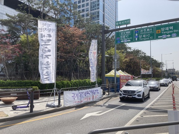 현대자동차그룹 사옥 인근에서 근거 없는 원직복직을 요구하며, 10년 이상 시위를 이어가고 있다. ⓒ 독자제공
