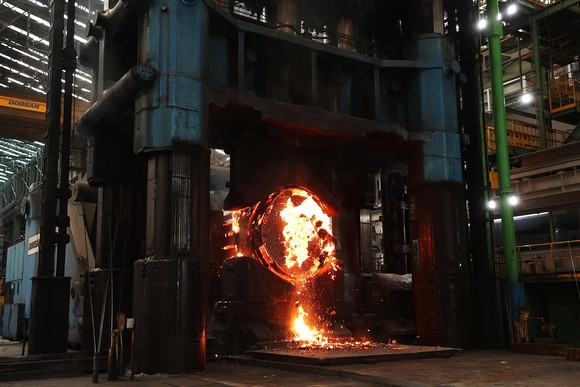 1만7000톤 프레스기가 신한울 3∙4 주기기 중 하나인 증기발생기 단조 소재 작업을 하고 있다. ⓒ 두산에너빌리티