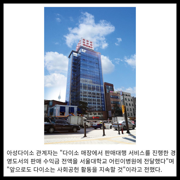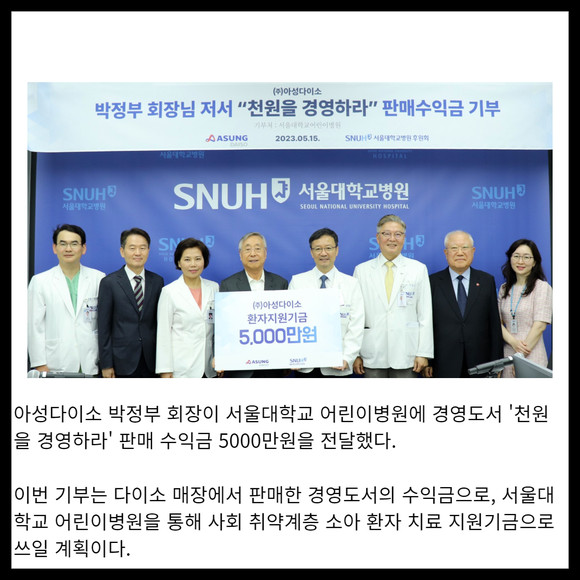 [프라임경제] 아성다이소 박정부 회장이 서울대학교 어린이병원에 경영도서 '천원을 경영하라' 판매 수익금 5000만원을 전달했다.